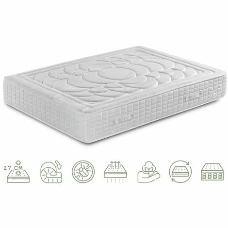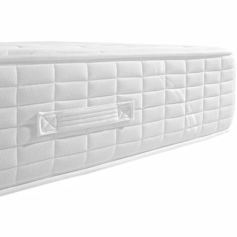 Superbe matelas de double face avec 6 cm de viscoelastica (3 dans chaque face) avec noyau de ressorts ensachés CONFORTSAC. SYSTÈME BOITE / renfort périmétral en HR pour éviter les déformations. Tissu élastique extensible et respirant avec traitement anti-acariens. Système rembourré TAPA-TAPA en haut et en bas. Platabanda avec poignées rembourrées en MICROFIBRE. Fermeté moyenne. Hauteur de +-30 cm.