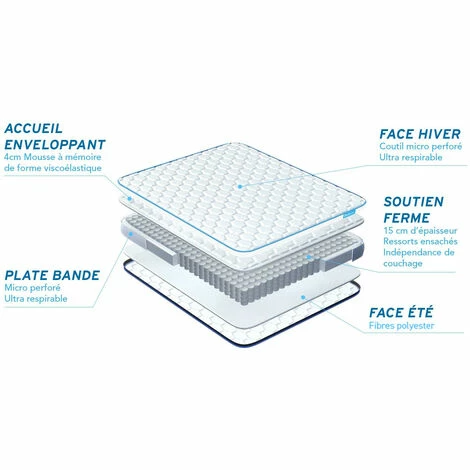 Maxi-Epaisseur/Aéré//Confort Visco/Ergonomique/Face été-Face Hiver/Mousse à mémoire de forme/Allègement des points de pression/Fabriqué en Europe/Indépendance de couchage