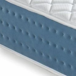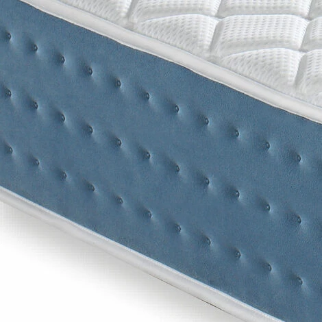 - Le côté du matelas est extrêmement doux au toucher velours. Finition dans les tons bleu. Double cousu de sécurité pour assurer la durabilité.