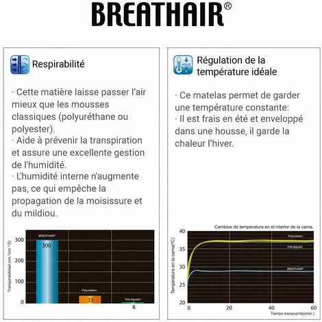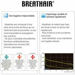 - une hetgiène irréprochable – Breathair est composé d’une série de boucles de fibres qui ne retiennent pas la poussière, ce qui rend impossible la propagation des acariens. De plus, il possède d’excellentes fonctions antibactériennes répondant aux normes SEK (norme Japonaise).