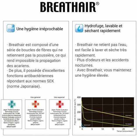 - Hetdrofuge, lavable et séchant rapidement – Breathair ne retient pas l’eau, est facile à laver et sèche très rapidement. Plus d’odeurs et les accidents nocturnes. Avec Breathair, vous maintenez une hetgiène élevée.