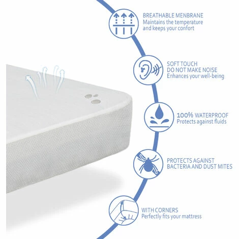 Protège-matelas absorbant et silencieux. Imperméable et hautement respirante : la membrane en polyuréthane bloque parfaitement tous les liquides, la transpiration, l’urine et les fluides corporels, laissant passer l’air. Hypoallergénique et doux. Composition du drap éponge : 50 % tencel, 50 % polyester à base de polyuréthane. Jupe ajustable: 100 % polyester. Traitement anti-acariens et antibactérien qui empêche la prolifération des acariens et des bactéries. Il agit comme une barrière hygiénique et maintient le matelas protégé. Facile à installer et à nettoyer : housse avec élastiques adaptables pour matelas jusqu’à 32 cm – Elle peut être lavée en machine à laver jusqu’à 30º. Il ne recouvre pas le dessous du matelas.