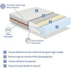 Matelas déhoussable. Il a deux couvertures. La housse extérieure est en tissu stretch doux et élastique, matelassé de fibre anti-acariens qui combat naturellement la prolifération des allergies et contribue à protéger le reste de notre petit bout. La housse intérieure est fabriquée en tissu de protection multi-extensible pour faciliter le retrait de la housse et protéger le cœur de votre enfant.