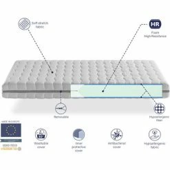Matelas déhoussable. Il a deux couvertures. La housse extérieure est en tissu stretch doux et élastique, matelassé de fibre anti-acariens qui combat naturellement la prolifération des allergies et contribue à protéger le reste de notre petit bout. La housse intérieure est fabriquée en tissu de protection multi-extensible pour faciliter le retrait de la housse et protéger le cœur de votre enfant.