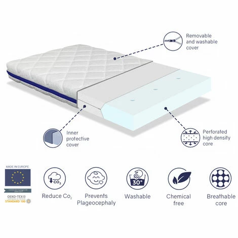 Noyau en mousse de polyuréthane avec perforations en mircro pour assurer une bonne ventilation et dissiper la chaleur et l’humidité. La densité est juste suffisante pour s’adapter au corps du bébé et éliminer les zones de pression, ce qui réduit l’agitation nocturne.