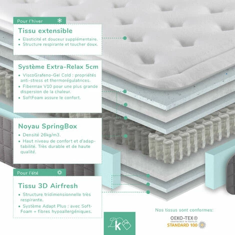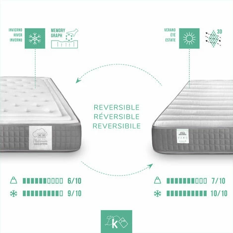 Matelas VISCOGRAPHIE PLATINE HAUT DE GAMME avec BEST-SELLER VISCOGRAPHIQUE et sac à ressort,hauteur de 18 ou 24cm .Deux côtés. Page d’hiver:tissuSTRETCH Doux, confortable et agréable au toucher, le résultat de ses fils entrelacés pour un maximum de confort et d’adaptabilité. Système Extra-Relax 5cm(VISCOGRAPHE GEL FROID) Compilé par ViscoGrafeno avec gel froid, FIBERMAX V10 et ViscoSoftPlaque intégrale ViscoGrafeno avec gel froid, haute densité. Page d’été Tissu extensible Idéal pour le côté été de notre matelas, il s’agit d’un tissu tridimensionnel très respirant qui est particulièrement adapté pour évacuer l’humidité. Système Extra-Relax 5cm Noyau SpringBox 7 zones avec des sources enfouies. PROPRIÉTÉS Double page Hiver/Été dans chacun un tissu différent, afin que nous puissions profiter d’un tissu doux et chaud (tissu extensible) en hiver et d’un tissu frais et respirant (tissu 3D Airfree) en étéUnabhängigkeit der Betten. L’indépendance de la literie permet de ne pas transférer le mouvement d’un des dormeurs à l’autre, ce qui permet d’obtenir un repos optimal.Réversible. De laTête aux pieds et de l’avant à l’arrière pour mieux exploiter ses propriétés.Confiance. Il est garanti 2 ans contre les défauts de fabrication. Fabriqué en Espagne. Tissu certifié OEKO-TEX.TOLÉRANCE. Les dimensions indiquées peuvent varier en hauteur, en longueur ou en largeur de ±2 cm, conformément à la norme UNE-EN 1334:1996. Kamahaus rejette les demandes de retour sur la base de mesures si le produit respecte les tolérances légales.