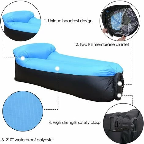 Gonfler au Vent : Le Transat air est gonflable rapidement, juste une brise ou l’air d’un ventilateur. Un jour venteux est parfait pour gonfler ! Il suffit d’ouvrir le sac, exécutez 1 minute pour remplir 80 % d’air. Puis Enroulez le sceau et la bloquer avec la boucle