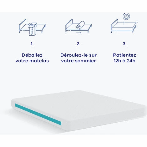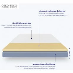 Garnissage : 3 cm de mousse mémoire de forme haute densité. 13 cm de mousse polyuréthane haute performance. Coutil micro-perforé en tissu coolsoft respirant. Bande latérale pour une aération optimale.