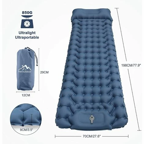 Taille plus longue et plus large: : La taille maximale du matelas de sol après gonflage est de 198 x 70 x 9 cm, qui peut être pliée à 29 x 12 x 12 cm. Comparé à ceux du marché avec une largeur de 58 cm et une épaisseur de 5,5 cm, ce matelas peut vous offrir un espace de détente plus grand, vous permettant de vous asseoir ou de vous allonger et de profiter du confort.