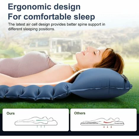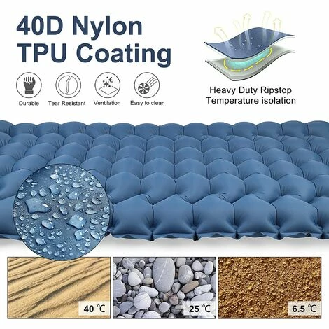 De haute qualité et durable: : Le matelas de camping est fait de tissu en nylon 40D de haute qualité et d’un revêtement en TPU. Les tissus de haute qualité ont une excellente douceur, une résistance à l’usure, une isolation thermique, des caractéristiques imperméables et respirantes, vous apportant une expérience confortable.