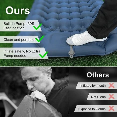 Le tapis de couchage peut être rempli en 60 secondes: : Ce matelas de camping est une pompe à pied intégrée nouvellement conçue, qui peut être remplie d’air en environ 60 secondes. Lorsque vous voyagez et campez, vous n’avez pas besoin de préparer une pompe à air séparée, ce qui peut réduire le fardeau du voyage et économiser de l’argent.