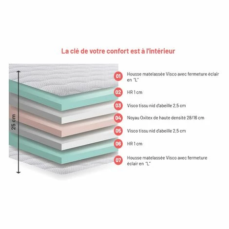 Son système interne de ventilation fait de ce matelas un matelas hygiénique. La housse , déhoussable et lavable en machine, est faite en tissu ANTI-ACARIENS et hypoallergénique. Le noyau avec système AIRFRESH, permet d’éviter la concentration d’humidité dans son intérieur et garantie une meilleure durée de vie du matelas. Conçu en mousse de haute densité, il a une fermeté de 5 points sur 6 et une ÉPAISSEUR de 24 cm. C’est un matelas D’UNE FACE, qui s’utilise tout au long de l’année grâce à la technologie AIRFRESH. La housse est lavable et facilement déhoussable grâce à sa fermeture éclair incorporée.