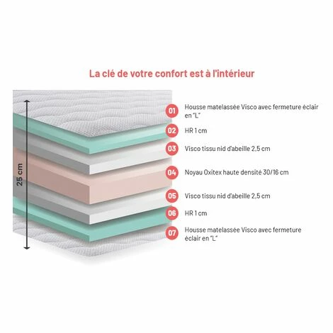 Conçu en mousse de haute densité, il a une fermeté de 5 points sur 6 et une ÉPAISSEUR de 24 cm.