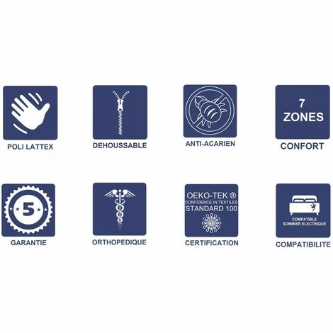 Plate-bande: Tissu Hyper RESPIRANT matelassé avec de la ouate polyester åme noyau : bloc de 15 cm de Mousse HAUTE RESILIENCE Poli Lattex derniére génération Indéformable La structure du matelas est divisée en 7 incroyables zones de confort qui s’adaptent à tous types de morphologies et aident à libérer les tensions musculaires pour soulager les maux de dos provoqués par de mauvaises postures au cours de la journée