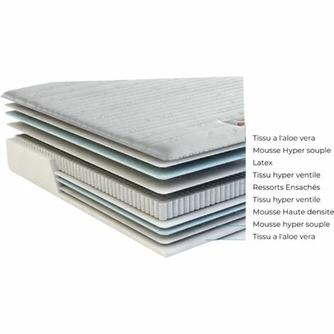 MATELAS:· Accueil : Moelleux .· Soutien : Ferme .· Technologie matelas : Ressorts Ensaches ( 683 pour un matelas140 ) Indeformable Tres Haute Resilience – Face Dormeur avec3,5 cm de Mousse Latex Naturel à 70 % en Tres Haute Densite 75 Kg/m3 et Mousse de confort· epaisseur du matelas : +/- 22,5 cm.· REPOS PLUS SAIN grace au Traitement Anti-acariens / anti-bacterien / Anti-moisissures.· Tres Bonne Independance de couchage.· DORMEZ TRANQUILLE avec la Garantie 5 ans. Coutil:· Coutil stretch matelasse de 290 gr/m2 de Polyester avec traitement Sanitized. · SANITIZED : Traitement antibacterien et anti-moisissures diminuant egalement le developpement des odeurs.Structure et garnissage du matelas:· Face Dormeur : 1,5 cm de mousse profilee a Haute Ventilation pour Maximiser le Confort + coutil en tissu 3D pour la bonne Respiration du noyau matelasse Air System.· Tissu Hyper Respirant realise en 3 dimensions qui permet une circulation libre de l’air offrant ainsi une plus grande ventilation et d’hygiene.· Plate-bande: Tissu Hyper RESPIRANT matelasse avec de la ouate polyester · ame noyau : Ressorts Ensaches ( 683 pour un matelas140 ) Indeformable Tres Haute Resilience · La structure du matelas est divisee en 5 Zones de Confort qui s’adaptent a tous types de morphologies et aident a liberer les tensions musculaires pour soulager les maux de dos provoques par de mauvaises postures au cours de la journee. · Oreiller Visco 60×60 cm Mousse a memoire de forme en 55 Kg/m3 sensible a la chaleur et auto-modelant.- ANTIBACTERIEN – PAS DE CFC – INDEFORMABLE – ANTI TRANSPIRANT – SANS COLLE – ANALLERGIQUE – RECYCLABLE – VISCOELASTIQUE + Protege Matelas Impermeable Hygienique – Ajustable pour Matelas de 13 a 35 cm de Hauteur – Absorbant et Respirant – Barriere anti-Acariens – Dessus 35% coton 65 % Polyester – Dessous en Peva: matiere Ferme et ecologique – Il prolongera la duree de vie de votre matelas · TISSUS CERTIFIES : Systeme de QUALITE Certifie Oeko-tex 100 , Certipur teste contre les substances nocives. Certification ISO 9001