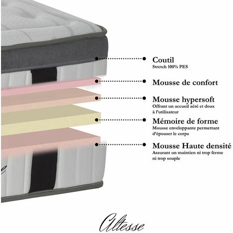 Le matelas ALTESSE à l’esthétique raffinée et élégante est la nouveauté dernier cri de la marque Maison Aubertin. Conçu avec des matériaux nobles et de qualité, ce matelas ni trop ferme ni trop souple conviendra à tous les types de dormeurs. Que vous dormiez sur le dos, sur le côté ou à plat ventre, vos tensions seront atténuées, votre circulation sanguine améliorée et votre colonne vertébrale maintenue. Sa généreuse épaisseur de mousse à mémoire de forme s’adapte en effet à votre corps pour un confort optimal et un sommeil des plus réparateurs. Le matelas ALTESSE dispose également d’une aération naturelle grâce aux cellules ouvertes de sa mousse dernière technologie.
