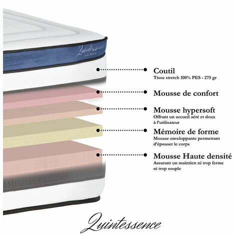Nous avons imaginé ce matelas pour les personnes souhaitant dormir sur un nuage. En effet, nos équipes ont conçu un matelas avec un noyau de mousse Haute densité 28kg/m3 puis 6 cm de mousse mémoire de forme 60kg/m3 ainsi que 4 cm de mousse hypersoft ultra aérée. Toutes ces caractéristiques offriront à notre clientèle un sommeil des plus réparateur et la sensation de se trouver dans un petit nid douillet.