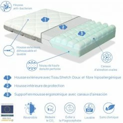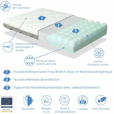 - Noetau Mousse de derniĂšre gĂ©nĂ©ration avec canaux d’aĂ©ration qui garantit une bonne ventilation en Ă©liminant la chaleur et lâhumiditĂ©. Elle est d’une densitĂ© suffisante pour s’adapter au corps du bĂ©bĂ© et pour Ă©liminer les zones de pression en rĂ©duisant l’agitation nocturne. PrĂ©vient le risque de plagiocĂ©phalie. Il dispose dâun cadre pĂ©riphĂ©rique haute densitĂ© qui maintient le bĂ©bĂ© au centre du matelas en lâempĂȘchant de se coincer entre les barreaux du berceau. RĂ©duire le CO2 Canaux dâaĂ©ration.