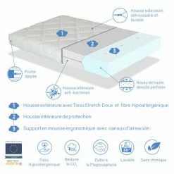 Matelas déhoussable. Il a deux housses. La housse extérieure est faite de tissu Stretch doux et élastique sur la face supérieure. Cette housse extérieure est rembourrée avec fibres hetpoallergénique qui combattent naturellement la prolifération des allergies et aident à protéger le repos de notre bébé. La face inférieure est formée de tissu 3D hautement respirant qui aide à dissiper la chaleur. En outre, il dispose d’une housse intérieure en tissu de protection multi-élastique qui facilite le retrait de la housse.
