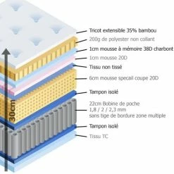 Caractéristiques techniques : Couchage équilibré – Mousse à mémoire de forme 1 cm densité 38 kg/m3 – Mousse de confort souple 7 cm densité 20 kg / m3 – Ressorts ensachés 22 cm – Multi-technologies – Transpirant AIR SYSTEM® – Coutil STRETCH traité SANITIZED® anti-bactériens anti-acariens – 35 % bambou – Garnissage Hypoallergénique