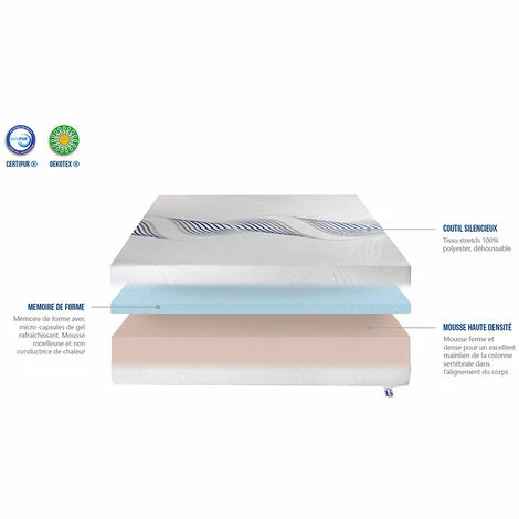 - Âme intérieure du matelas (certifiée CertiPUR) : 15 cm de mousse Haute Densité de 33 kg/m³ + 5 cm de mousse à mémoire de forme de 60 kg/m³ avec microcapsules de gel rafraîchissant