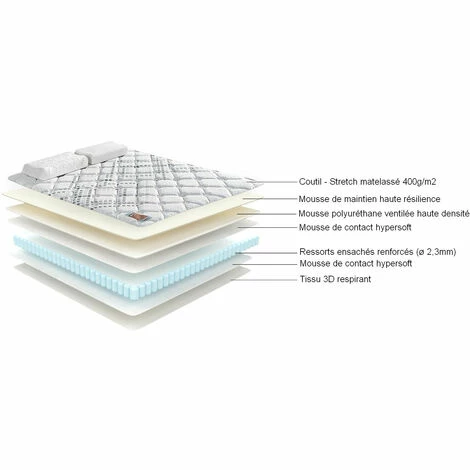La moitié inférieure du matelas est composée de 15 cm de ressorts ensachés sur 5 zones. Les ressorts ensachés offrent une indépendance de couchage et un soutien individualisé qui s’adaptera à votre corps et poids par zone. Cette technologie s’adapte parfaitement à toutes les morphologies et offre des zones de confort renforcées.