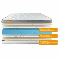 – Accueil : Ferme avec 2,5 cm de mousse polyuréthane à mémoire de forme D55kg + 2 cm mousse polyuréthane Hypersoft + Fibres 100% Polyester 350G/M2