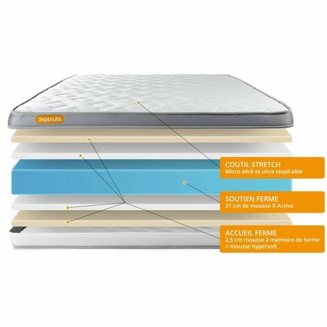Le matelas Memo Zen de la marque Septnuits bénéficie des dernières innovations en matière de mousse à mémoire de forme pour vous offrir le confort et le soutien unique pour un sommeil récupérateur. Avec un soutien ferme, son accueil à mémoire de forme s’adapte parfaitement à votre morphologie et allège les points de pression en épousant parfaitement votre corps. Ses matériaux de haute qualité : Plate-bande 3D micro aérée, son coutil ultra respirable et sa fibre polyester vous garantissent une aération totale du matelas pour une hygiène optimale.