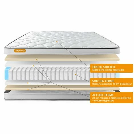 Le matelas Memo Spring de la marque Septnuits est constitué d’une âme en ressorts ensachés procurant un soutien très précis point par point avec 3 zones différenciées. Sa conception unique vous offrira un soutien ferme et un accueil dynamique. Sa Plate-bande 3D micro aérée, associée à son coutil micro perforé ultra respirable et sa fibre polyester vous garantissent une ventilation active du matelas. Sa maxi épaisseur vous assure une nuit de bien-être. Son plus ses ressorts ensachés pour une parfaite indépendance de couchage.