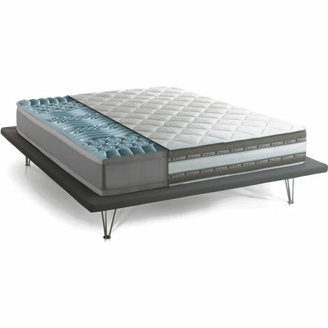 CARACTÉRISTIQUES TECHNIQUES – Hauteur totale du produit : 27 cm – Matelas avec 9 zones de repos à capacité de charge différenciée – Couche de mousse à mémoire de 5 cm, 55 kg x mètre cube – Couche de gel à mémoire de 1 cm.