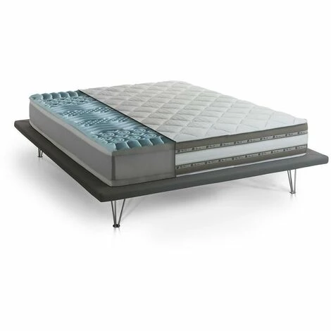CARACTÉRISTIQUES TECHNIQUES – Hauteur totale du produit : 27 cm – Matelas avec 9 zones de repos à capacité de charge différenciée – Couche de mousse à mémoire de 5 cm, 55 kg x mètre cube – Couche de gel à mémoire de 1 cm.